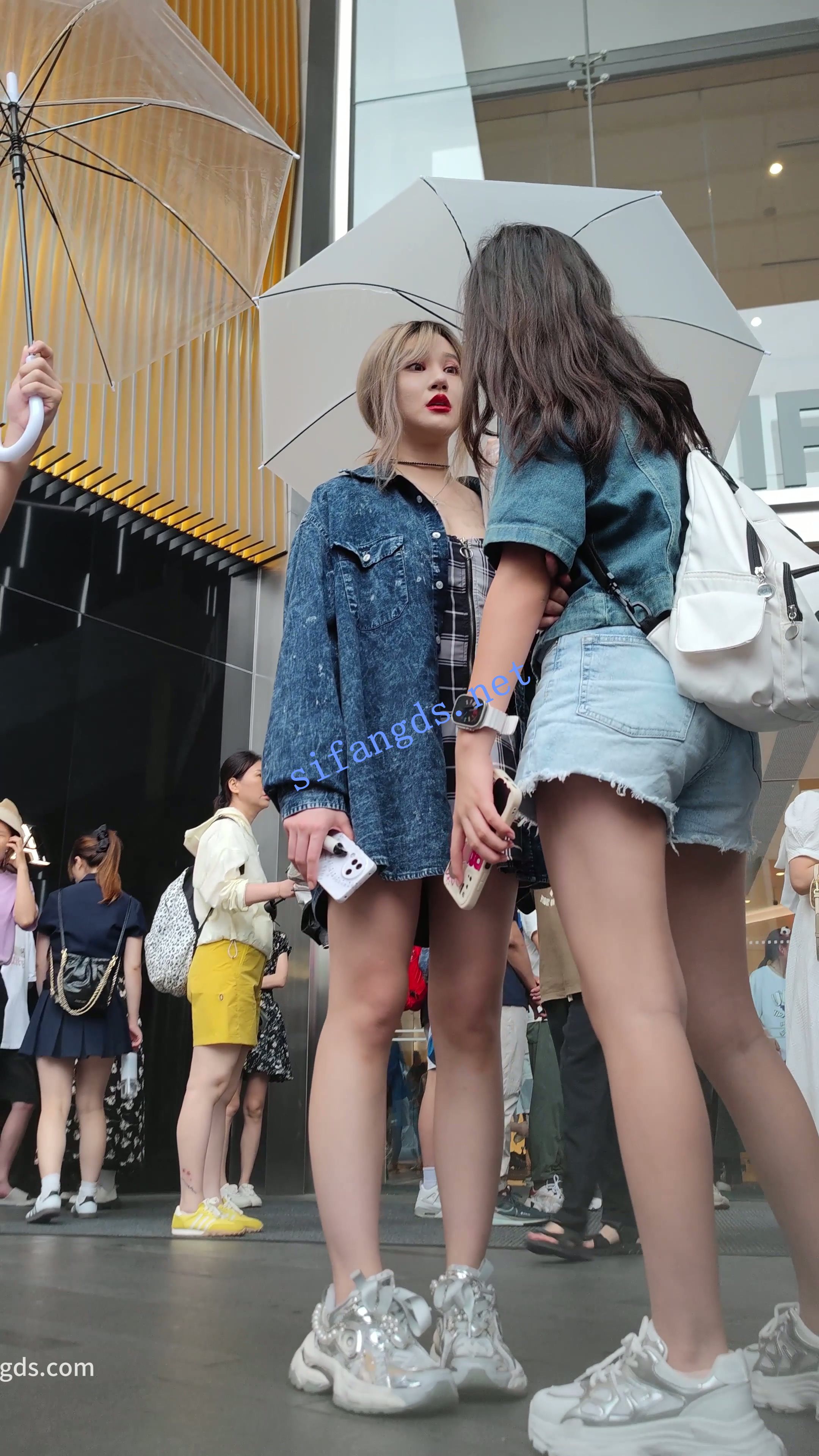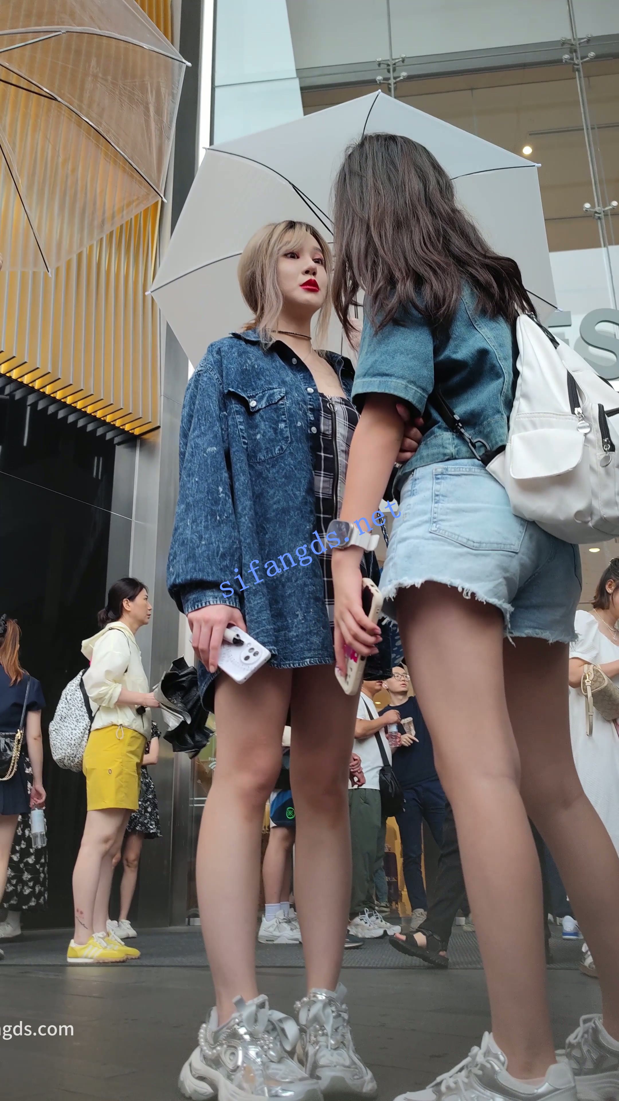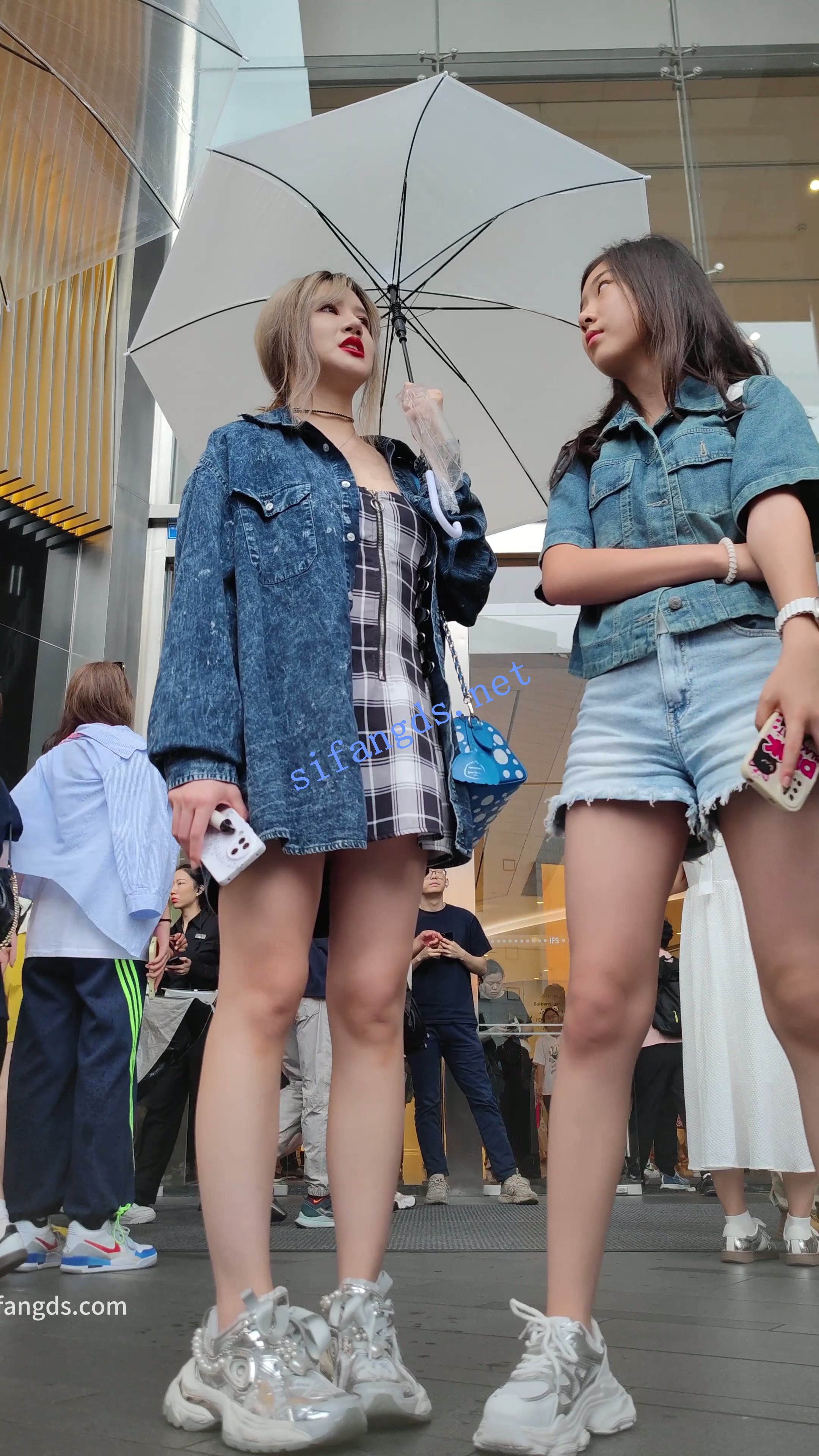 【说明】:格子连衣裙美女和闺蜜下雨等车,白色内内