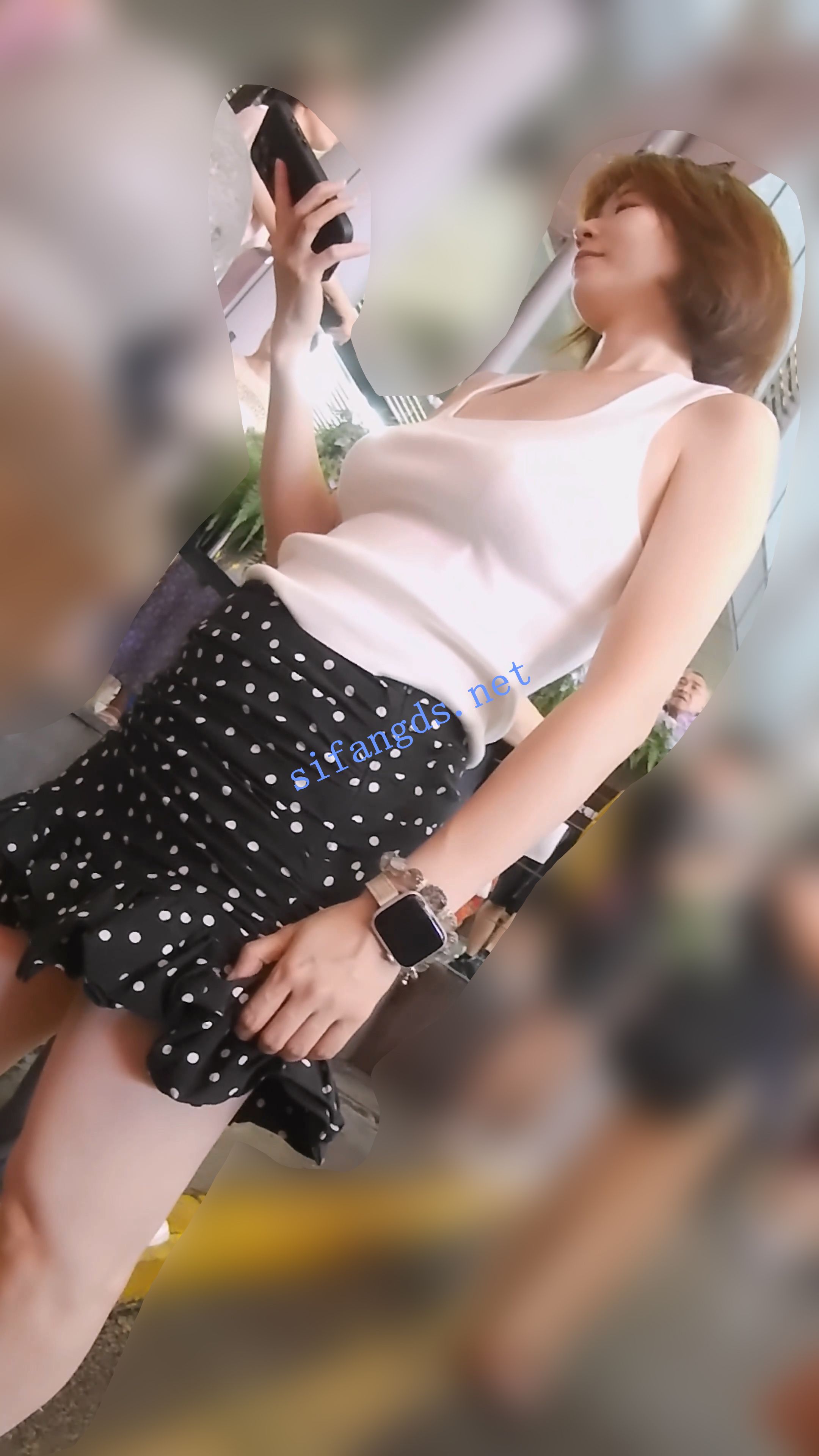 夜拍短发女郎,笑容可爱,波点黑裙,浅蓝窄内。