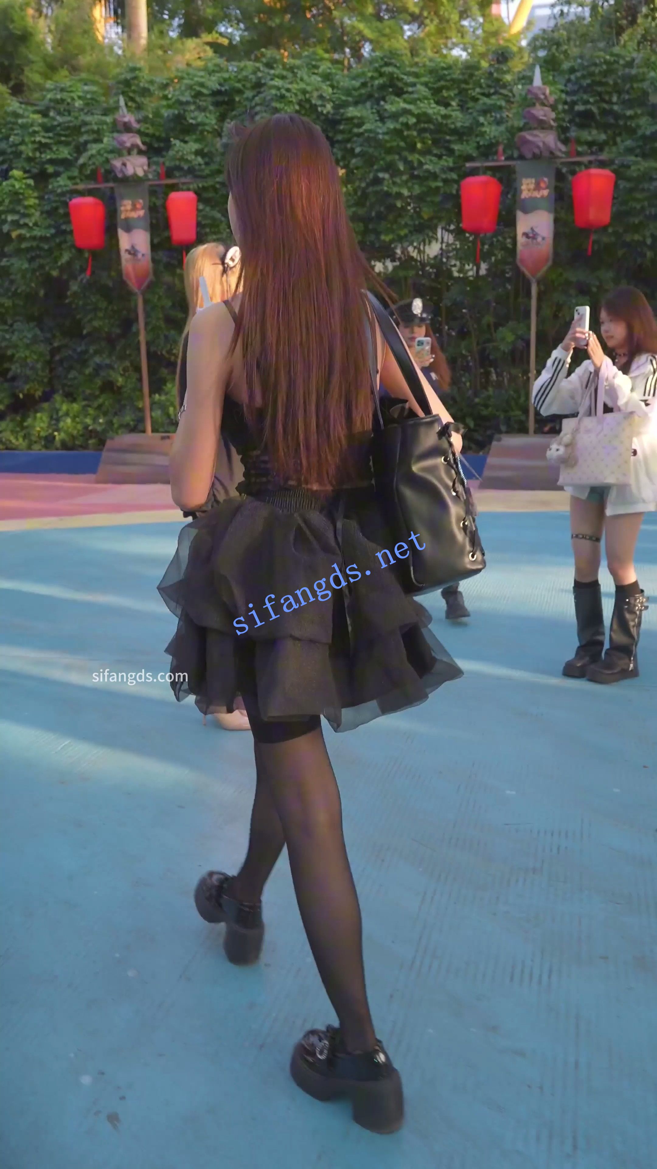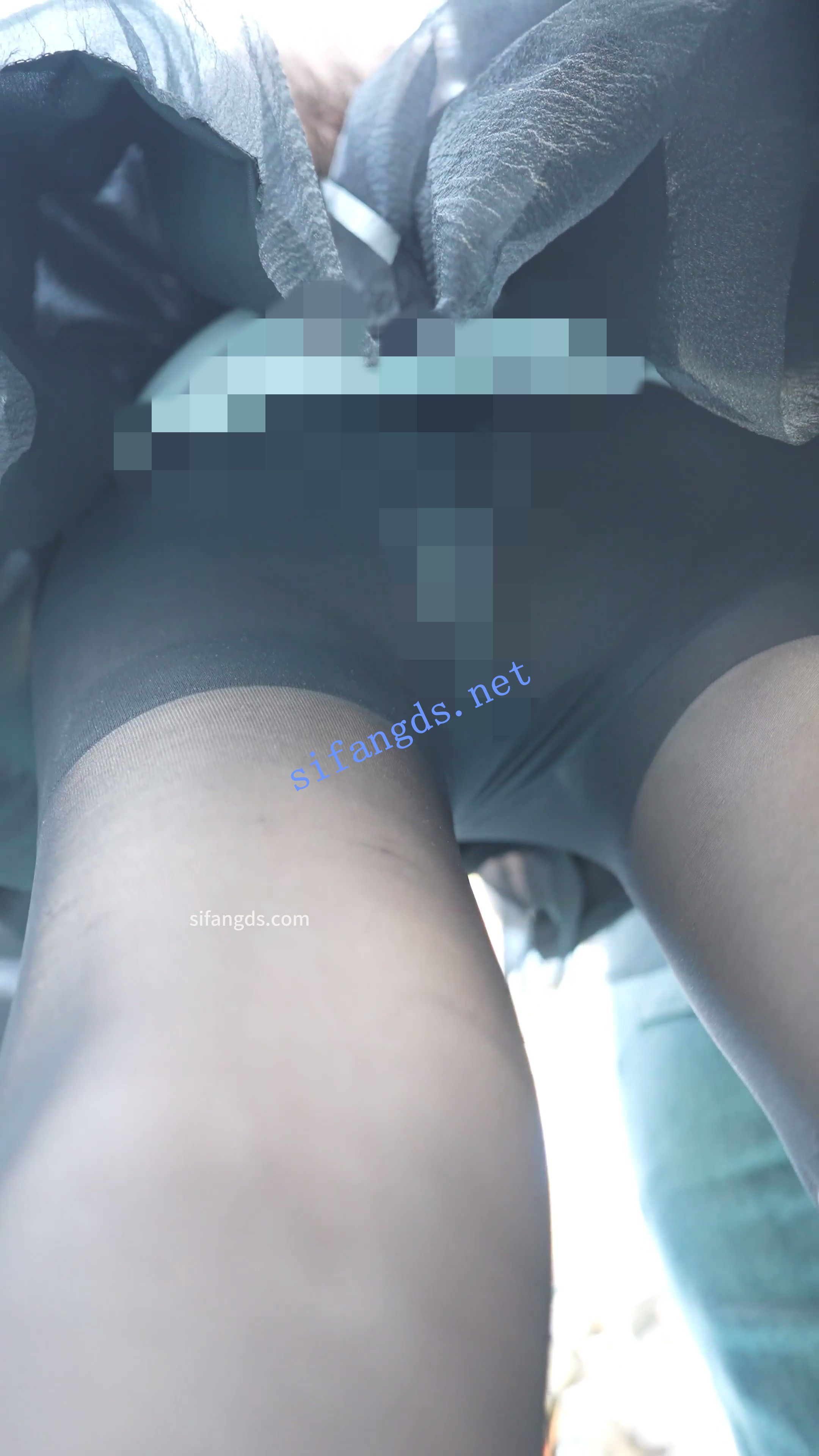 吊带裙小姐姐逛街,黑色丝袜太短,屁股没有包住,一半内裤露在丝袜外面,排队拍照被CD。。
